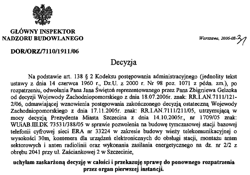 swoją decyzję z dnia 3 sierpnia 2006 r. znak WS-N.NZ-401-1532/06 dotycząca wznowienia postępowania administracyjnego w sprawie uzgodnienia w zakresie ochrony zdrowia ludzi projektu budowlanego stacji bazowej telefonii komórkowej sieci PTC ERA nr 33224 na działce nr 2/2 przy ul. Zaściankowej 2 w Szczecinie.