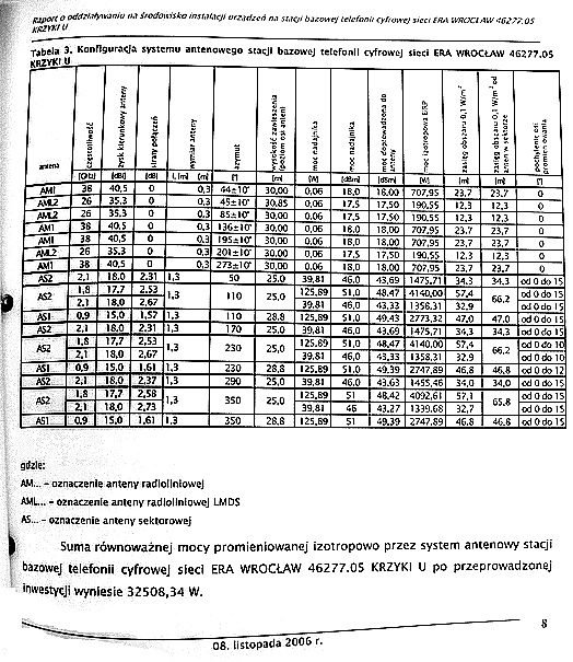 Tabela 3 od lewej: Antena, Częstotliwość, zysk kierunkowy anteny, straty połączeń, wymiar anteny, azymut, wysokość zawieszenia (poziom osi anten), moc nadajnika, moc doprowadzenia do anteny, moc izotropowa EIRP, zasięg obszaru 0,1 wata/m2, zasięg obszaru 0,1 wata/m2 od anten w sektorze, pochylenie osi promieniowania.