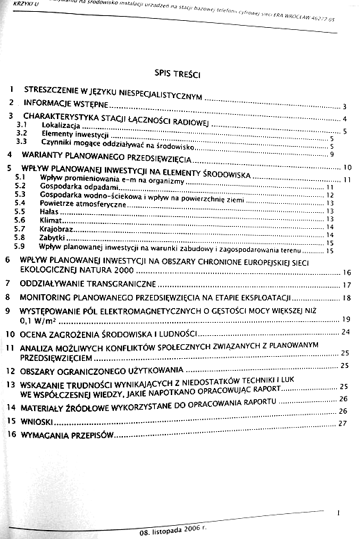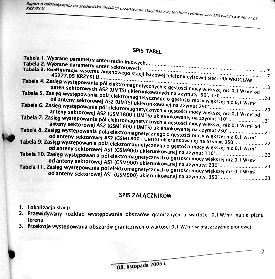8.11.06, Raport oddziaływania na środowisko, Spis treści, Spis tabel