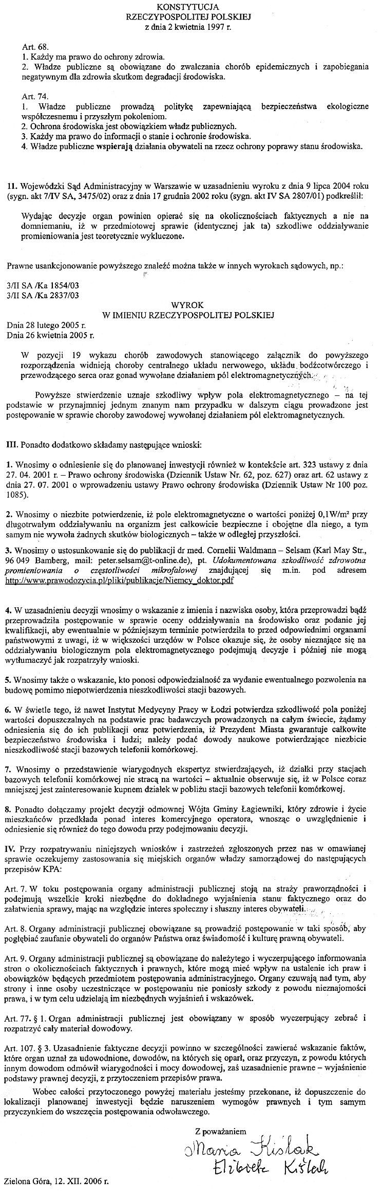 wnosimy także o wskazanie, kto ponosi odpowiedzialność za wydanie ewentualnego pozwolenia na budowę pomimo niepotwierdzenia nieszkodliwości stacji bazowych. Wnosimy o przedstawienie wiarygodnych ekspertyz stwierdzających, iż działki przy stacjach bazowych telefonii komórkowej nie stracą na wartości -aktualnie obserwuje się, iż w Polsce coraz mniejsze jest zainteresowanie kupnem działek w pobliżu stacji bazowych telefonii komórkowej. |