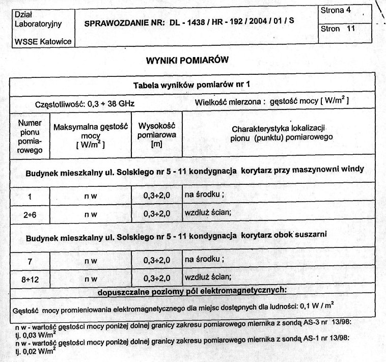 Wojewódzka Stacja Sanitarno-Epidemiologiczna w Katowicachul. Raciborska 39, 40-957 Katowice 2 skrytka pocztowa 591 Dział Laboratoryjny Oddział Badań Higieny Radiacyjnej Sprawozdanie nr: DL - 1438 / HR - 192 / 2004 / 01/ S Temat: POMIAR GĘSTOŚCI MOCY PROMIENIOWANIA ELEKTROMAGNETYCZNEGO w zakresie 0,3 GHz - 38 GHz dla środowiska. Klient: Spółdzielnia Mieszkaniowa Śródmieście 44-100 Gliwice, ul. Jasnogórska 9 Wyniki pomiarów, tabela wyników nr 1, budynek mieszkalny ul. Solskiego nr 5 - 11 kondygnacja korytarz przy maszynowni windy, budynek mieszkalny ul. Solskiego nr 5 - 11 kondygnacja korytarz obok suszarni Dopuszczalne poziomy pól elektromagnetycznych gęstość mocy promieniowania elektromagnetycznego dla miejsc dostępnych dla ludności: 0,1 W / m2 nw - wartość gęstości mocy poniżej dolnej granicy zakresu pomiarowego miernika z sondą AS-3 nr 13/98: tj. 0,03 W/m2 nw - wartość gęstości mocy poniżej dolnej granicy zakresu pomiarowego miernika z sondą AS-1 nr 13/98: tj. 0,02 W/m2 | |||||
