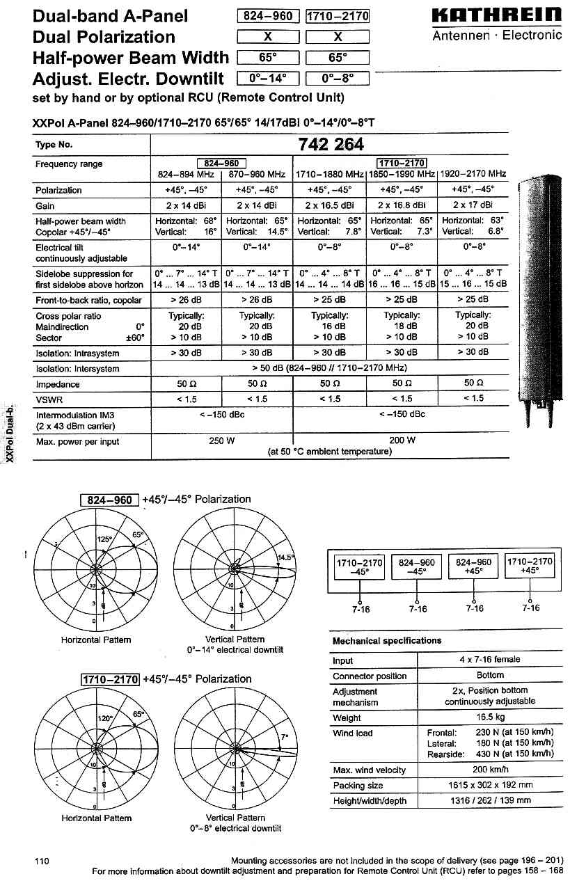 Lublin, Raport o oddziaływaniu na środowisko, Kathrein Dualband A-Panel 1710-2170 Adjust. Electrical Downtilt set by hand or by optional (RCU Remote Control Unit) ERA Nr 27063 Lublin-LSM str 29 |