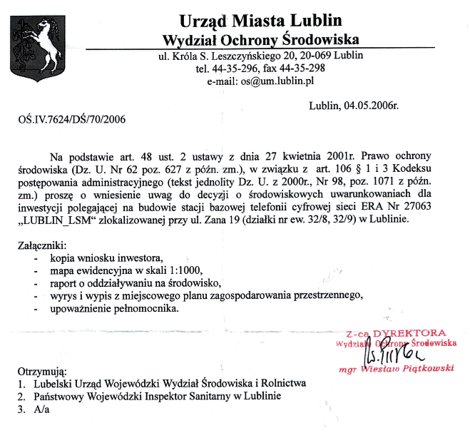 4 maj 2006 r., Wydział Ochrony Środowiska, prośba o uwagi przez wydział Środowiska i Rolnictwa oraz przez PWIS w Lublinie dla ERA Nr 27063 Lublin-LSM4 maja 2006 r. |