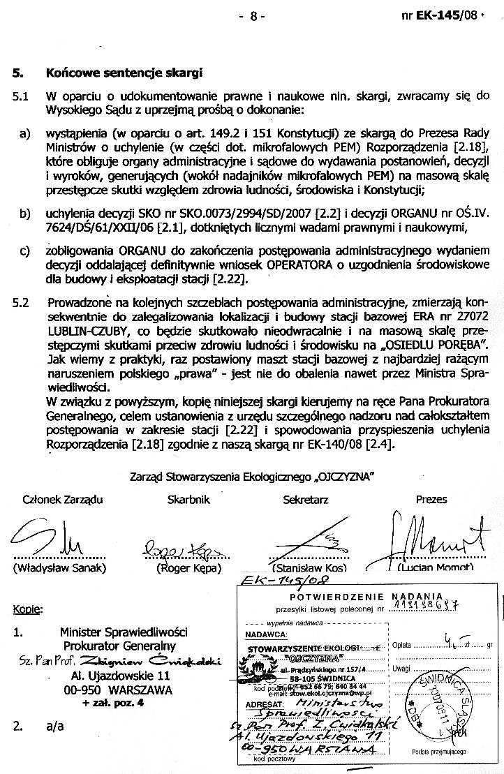 Stowarzyszenie Ekologiczne Ojczyzna 58-105 Świdnica Lublin. Skarga o uchylenie Decyzji SKO z dnia 30.06.2008r. końcowe sentencje skargi: Prowadzone na kolejnych szczeblach postępowania administracyjne, zmierzają konsekwentnie do zalegalizowania lokalizacji i budowy stacji bazowej ERA nr 27072 Lublin-Czuby, co będzie skutkowało nieodwracalnie i na masową skalę przestępczymi skutkami przeciw zdrowiu ludności i środowisku na "Osiedlu Poręba". Kopię niniejszej skargi kierujemy na ręce Pana Prokuratora Generalnego Pana Profesora Zbigniewa Ćwiąkalskiego Strona skarżąca: Stowarzyszenie Ekologiczne Ojczyzna 58-105 Świdnica Strona przeciwna: Samorządowe Kolegium Odwoławcze w Lublinie ul. Zana 38c 20-601 Lublin Skarga nr EK-145/08 o uchylenie Decyzji SKO z dnia 30.06.2008r. oraz Decyzji Prezydenta Lublina z dnia 9.11.2007r. |