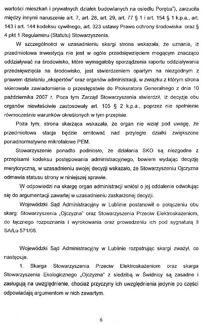Lublin. Sygn. akt II SA/Lu 571/08 - Wyrok WSA w Lublinie, Data orzecz enia 2008-12-16, wpłynęło 09.01.2009r. Wynik: Uchylono decyzję I i II instancji, Uzasadnienie wyroku c.d. : Wojewódzki Sąd Administracyjny w Lublinie rozpatrując skargi zważył, co następuje. 1. Skarga Stowarzyszenie Przeciw Elektroskażeniom w Lublinie oraz skarga Stowarzyszenie Ekologiczne Ojczyzna z siedzibą w Świdnicy są zasadne i zasługują na uwzględnienie, chociaż przyczyny ich uwzględnienia jedynie po części odpowiadają argumentom w nich zawartym. Stowarzyszenie Ekologiczne Ojczyzna 58-105 Świdnica Lublin. Skarga o uchylenie Decyzji SKO z dnia 30.06.2008r. Załączniki do skargi Strona skarżąca: Stowarzyszenie Ekologiczne Ojczyzna 58-105 Świdnica Strona przeciwna: Samorządowe Kolegium Odwoławcze w Lublinie ul. Zana 38c |