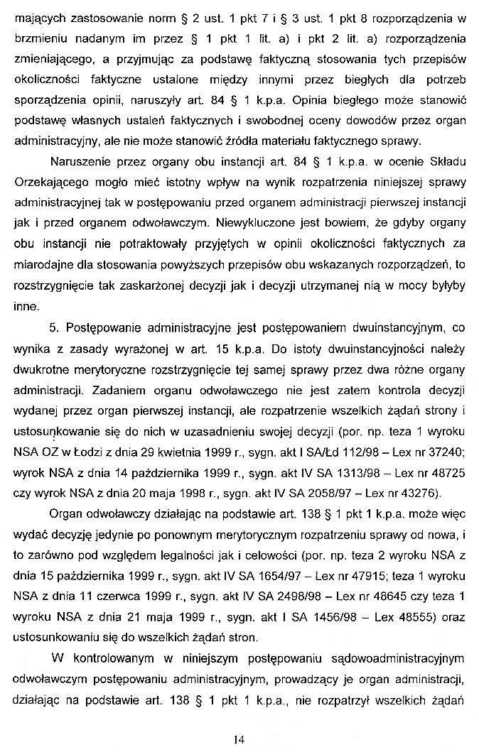 | Lublin. Sygn. akt II SA/Lu 571/08 - Wyrok WSA w Lublinie, Data orzecz enia 2008-12-16, wpłynęło 09.01.2009r. Wynik: Uchylono decyzję I i II instancji, Uzasadnienie wyroku c.d. : 1 Opinia biegłego stanowi bowiem jedynie ocenę grupy faktów przy użyciu ustawowych lub subiektywnych kryteriów opiniującego, dotyczącą stanu faktycznego dokonaną przez naświetlenie i wyjaśnienie okoliczności wskazanych przez organ administracji z punktu widzenia posiadanych przez biegłego wiadomości specjalnych. Opinia ta nie może jednak zastąpić swobodnej oceny dowodów oraz ustalenia przesłanek wymaganych przepisami prawa materialnego (por. teza 2 wyroku NSA z dnia 28 września 2001 r., sygn. akt II SA 1818/00 - Lex nr 53353; wyrok NSA z dnia 27 października 2003 r., sygn. akt I SA 220/02 - system informacji prawnej Legalis). Opinia biegłego może stanowić podstawę własnych ustaleń faktycznych i swobodnej oceny dowodów przez organ administracyjny, ale nie może stanowić źródła materiału faktycznego sprawy. Stowarzyszenie Ekologiczne Ojczyzna 58-105 Świdnica Lublin. Skarga o uchylenie Decyzji SKO z dnia 30.06.2008r. Załączniki do skargi Strona skarżąca: Stowarzyszenie Ekologiczne Ojczyzna 58-105 Świdnica Strona przeciwna: Samorządowe Kolegium Odwoławcze w Lublinie ul. Zana 38c | ||||||||||
