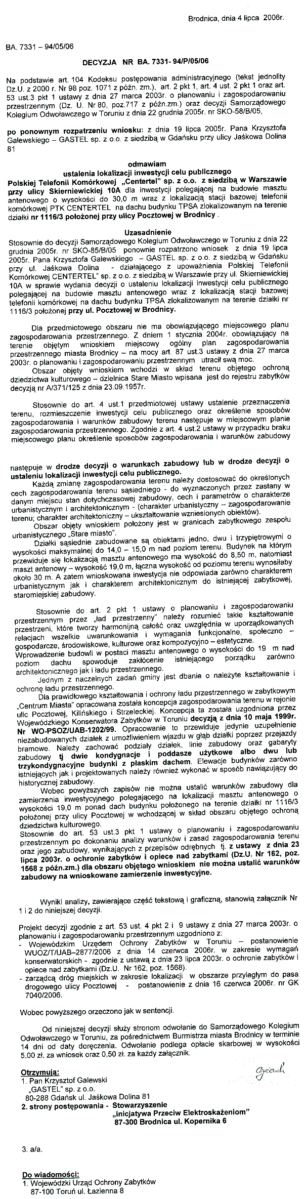 Brodnica, strona główna 29 kwietnia 2005 wyrok w Brodnicy jest prawomocny! Burmistrz Brodnicy walczy z operatorami telefonii komórkowej wyrok sądu Historyczna decyzja wycinki z gazet lokalnych: 17.11.05 | 21.11.05 | 25.11.05 Kolejna decyzja przeciwko najemnikom POLKOMTELA Opinia ekonomiczna dotycząca ksztaltowania się wartości nieruchomości zlokalizowanych w strefie oddziaływania stacji bazowych telefonii komórkowych - na terenie miasta Brodnica Brodnica, odmowa nr 13: inwestycja telefonii komórkowej nie odpowiada zarówno charakterem urbanistycznym jak i charakterem architektonicznym do istniejącej zabytkowej staromiejskiej zabudowy. Decyzja Nr BA. 7331-94/P/05/06 plik oryginalny (.pdf, 301 KB) |