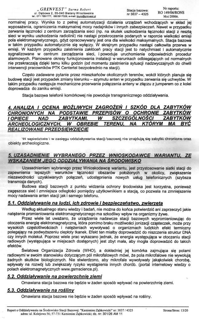 | Ocena zagrożeń dla zabytków. Uzasadnienie wybranego wariantu. Oddziaływanie na ludzi ich zdrowie i bezpieczeństwo, zwierzęta. Raport o oddziaływaniu przedsięwzięcia na środowisko nr RO 149/06/RONS rozbudowa stacji bazowej nr 3837/4325 "Kamieniec Ząbkowicki" PTK Centertel Orange (France Telecom) w Kamieńcu Ząbkowickim. EIRP "jest?" 15968 W (>100 W), Nr działki 301/26 AM 11, 57-731 Kamieniec Ząbkowicki, Kolejowa 56, autorem opracowania jest mgr inż. Robert Surma, mai 2006, Grinvest. | ||