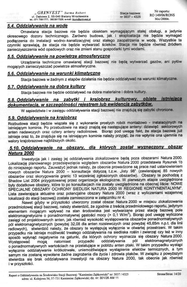 Oddziaływanie na wodę, na powietrze, na klimat, na dobra kultury i dobra materialne, na zabytki, na krajobraz, na obszar Natura 2000. Raport o oddziaływaniu przedsięwzięcia na środowisko nr RO 149/06/RONS rozbudowa stacji bazowej nr 3837/4325 "Kamieniec Ząbkowicki" PTK Centertel Orange (France Telecom) w Kamieńcu Ząbkowickim. EIRP "jest?" 15968 W (>100 W), Nr działki 301/26 AM 11, 57-731 Kamieniec Ząbkowicki, Kolejowa 56, autorem opracowania jest mgr inż. Robert Surma, mai 2006, Grinvest.