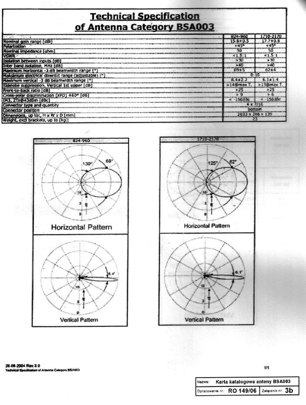 | Technical Specification of Antenna Category BSA003 Raport o oddziaływaniu przedsięwzięcia na środowisko nr RO 149/06/RONS rozbudowa stacji bazowej nr 3837/4325 "Kamieniec Ząbkowicki" PTK Centertel Orange (France Telecom) w Kamieńcu Ząbkowickim. EIRP "jest?" 15968 W (>100 W), Nr działki 301/26 AM 11, 57-731 Kamieniec Ząbkowicki, Kolejowa 56, autorem opracowania jest mgr inż. Robert Surma, mai 2006, Grinvest. puknięcie powoduje powiększenie | ||