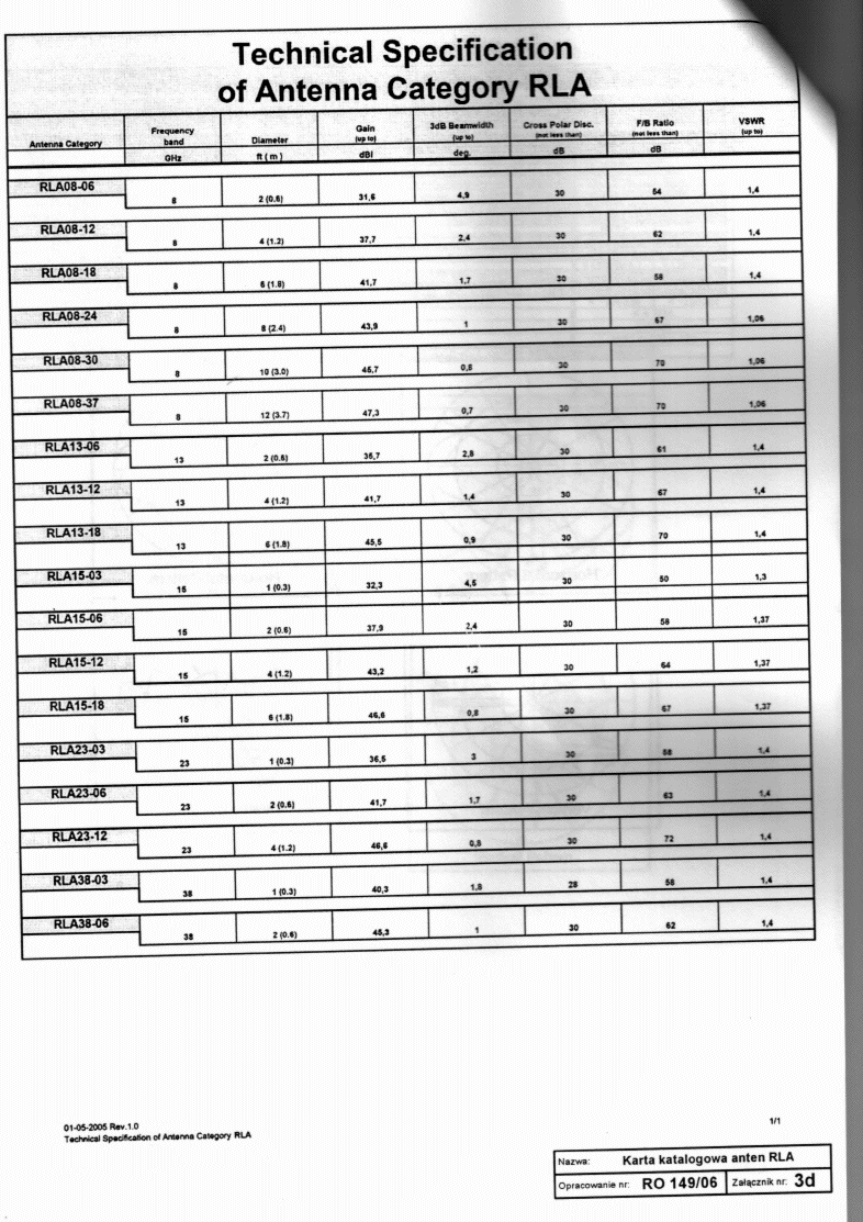 | Technical Specification of Antenna Category RLA. Raport o oddziaływaniu przedsięwzięcia na środowisko nr RO 149/06/RONS rozbudowa stacji bazowej nr 3837/4325 "Kamieniec Ząbkowicki" PTK Centertel Orange (France Telecom) w Kamieńcu Ząbkowickim. EIRP "jest?" 15968 W (>100 W), Nr działki 301/26 AM 11, 57-731 Kamieniec Ząbkowicki, Kolejowa 56, autorem opracowania jest mgr inż. Robert Surma, mai 2006, Grinvest. | ||