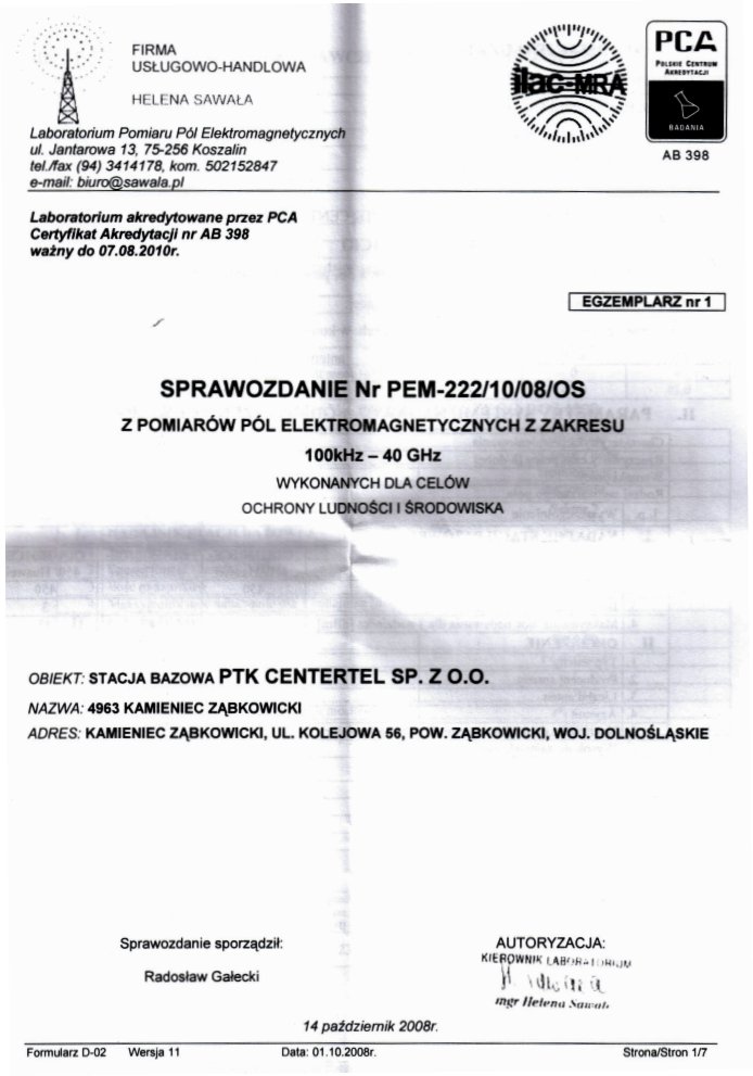 | Firma Usługowo-Handlowa Helena Sawała Laboratorium Pomiaru Pól Elektromagnetycznych ul. Jantarowa 13, 75-256 Koszalin tel./fax (94) 3414178, kom. 502152847 e-mail: biuro@sawala.pl Laboratorium akredytowane przez PCA Certyfikat Akredytacji nr AB 398 ważny do 07.08.2010r. SPRAWOZDANIE Nr PEM-222/10/08/OS Z POMIARÓW PÓL ELEKTROMAGNETYCZNYCH Z ZAKRESU 100 KHz - 40 GHz WYKONANYCH DLA CELÓW OCHRONY LUDNOŚCI I ŚRODOWISKA OBJEKT: STACJA BAZOWA PTK CENTERTEL SP. ZO.O. NAZWA: 4963 Kamieniec Ząbkowicki ADRES: Kamieniec Ząbkowicki, UL. KOLEJOWA 56, POW. Ząbkowicki, WOJ. DOLNOŚLĄSKIE Sprawozdanie sporządził Radosław Gałecki | ||