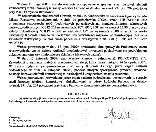 Wobec powyższego prowadzone przez organ nadzoru budowlanego postępowanie w sprawie stacji bazowej telefonii komórkowej zlokalizowanej w wieży kościoła Farnego na działce nr ewid. 971 obr. 207 położonej przy Placu Farnym w Rzeszowie stało się bezprzedmiotowe.